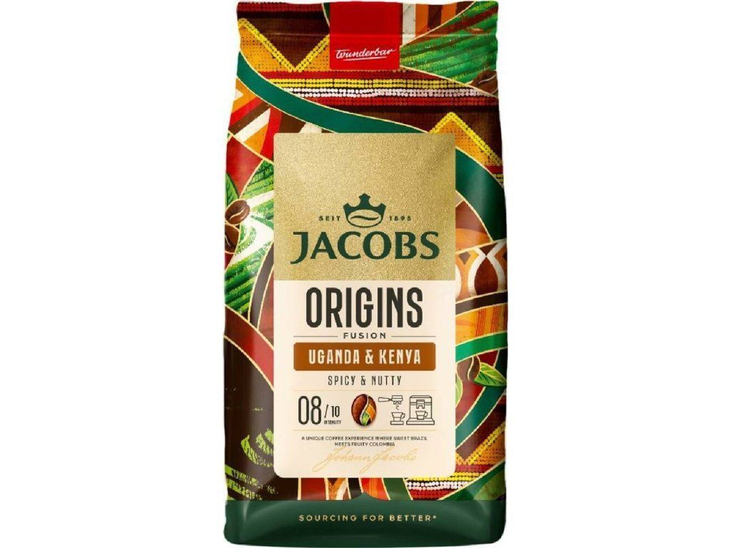 Zrnková káva Jacobs Origins Fusion Uganda&Kenya, prvotřídní 100% arabika, je určená zejména do kávovaru nebo espressovače.